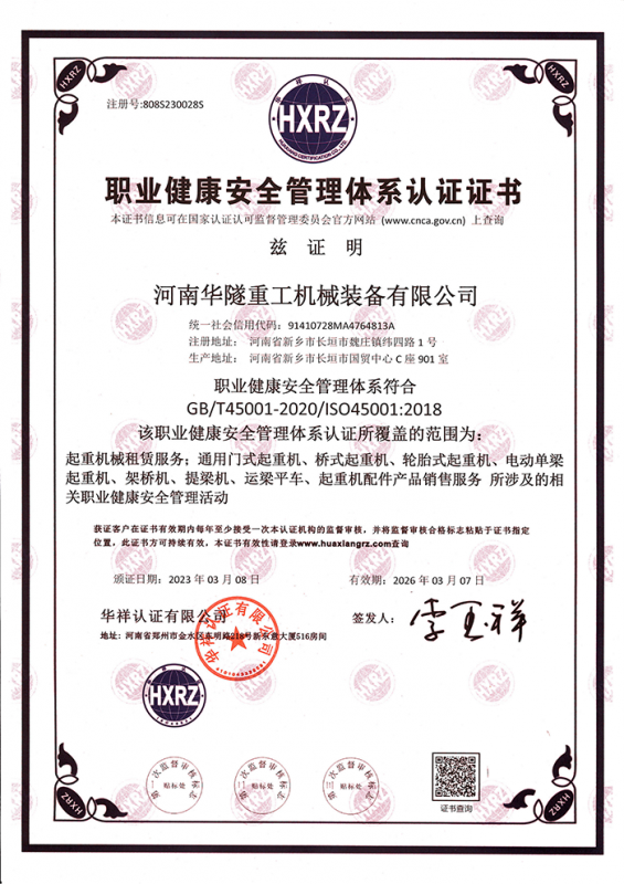 河南華隧重工機(jī)械裝備有限公司主要從事通用門式起重機(jī)、橋式起重機(jī)、電動(dòng)單梁起重機(jī),輪胎式起重機(jī)、架橋機(jī)、提梁機(jī)、遠(yuǎn)梁平車、鋼絲繩電動(dòng)萌蘆、卷揚(yáng)機(jī)、起重配件制造、銷售:起重機(jī)械租賃、安裝和維修,起重設(shè)備園收,機(jī)械設(shè)備維修,鋼結(jié)構(gòu)工程承包,橋梁工程及技術(shù)咨淘服務(wù),銷售五金制品、機(jī)電設(shè)備:建設(shè)工程監(jiān)理,建設(shè)工程設(shè)計(jì),各類工程建設(shè)活動(dòng),建筑勞務(wù)分包,建筑物折除作業(yè),施工作業(yè),工程管理服務(wù),土石方工程施工,裝如發(fā)運(yùn)。  公司已通過IS0國際質(zhì)量、環(huán)境、健康與安全三合一標(biāo)準(zhǔn)認(rèn)證,特種設(shè)備制造許可證和特種設(shè)備安裝改造維修許可證。擁有完熟的質(zhì)量管理體系。嚴(yán)格的管理制度,強(qiáng)大的生產(chǎn)能力和先進(jìn)的檢測手段,在保證產(chǎn)品質(zhì)量的同時(shí),也具備了極強(qiáng)的市場競爭力。  公司堅(jiān)持科技創(chuàng)新為理念,產(chǎn)品質(zhì)量為核心,注重信譽(yù),建立了減信可靠、快捷、思速。便利周到的售后服務(wù)網(wǎng)絡(luò)。  我們擁有的技術(shù)專家和技術(shù)服務(wù)隊(duì)伍為客戶提供充善的售前技術(shù)支持和全天候的售后服務(wù)體系,讓您無后顧之憂,享受一站式的超值服務(wù)。  “華隧重工,伴您成功“是華隧重工永遠(yuǎn)的宗指,真被的希望與各界朋友攜手并進(jìn)。共創(chuàng)輝準(zhǔn)!